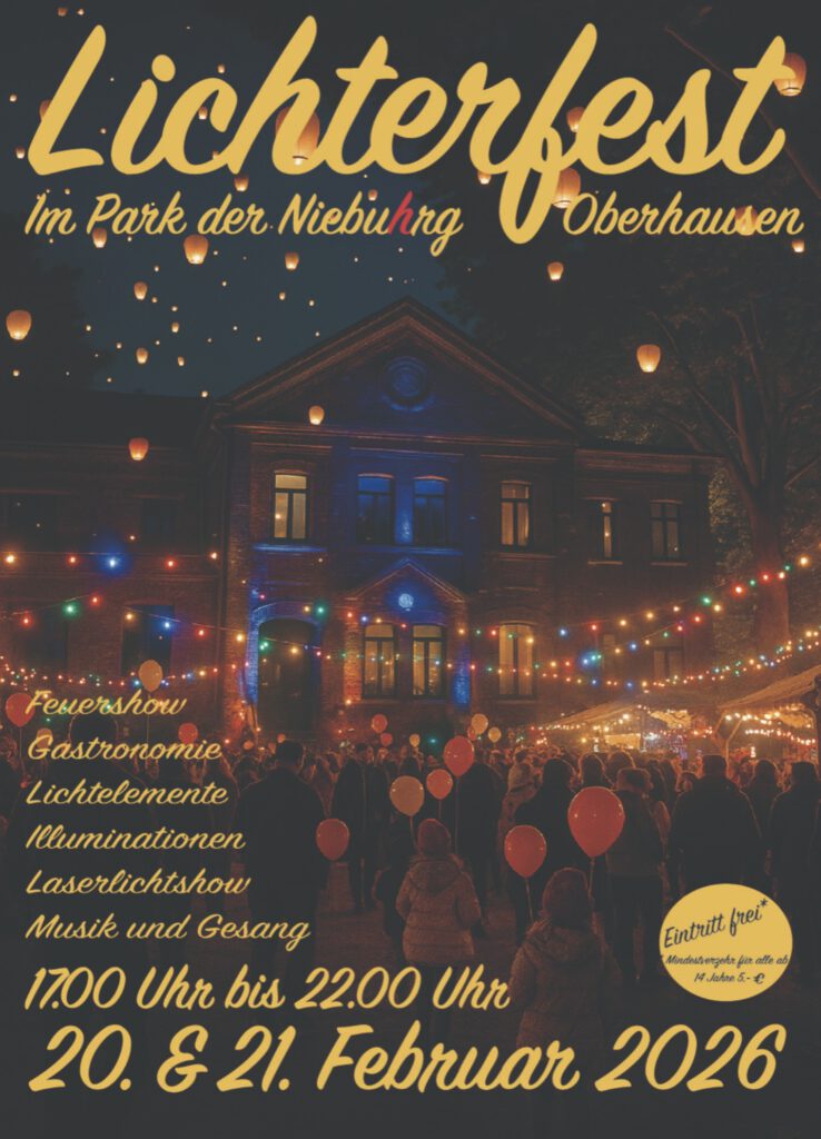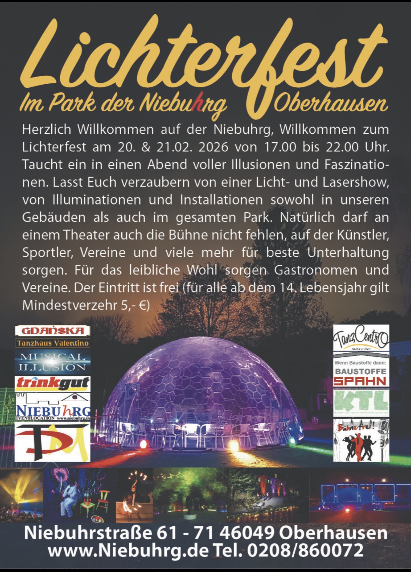 Herzlich Willkommen auf der Niebuhrg, Willkommen zum Lichterfest am 20. & 21.02. 2026 von 17.00 bis 22.00 Uhr Taucht ein in einen Abend voller Illusionen und Faszinatio- nen. Lasst Euch verzaubern von einer Licht- und Lasershow, von Illuminationen und Installationen sowohl in unseren Gebäuden als auch im gesamten Park. Natürlich darf an einem Theater auch die Bühne nicht fehlen, auf der Künstler, Sportler, Vereine und viele mehr für beste Unterhaltung sorgen. Für das leibliche Wohl sorgen Gastronomen und Vereine. Der Eintritt ist frei (für alle ab dem 14. Lebensjahr gilt Mindestverzehr 5,- €)