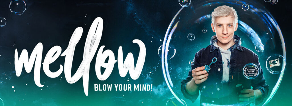 Mellow katapultiert dich in ein neues Universum! Der sympathische Magier im Kapuzenpulli ist Deutscher Meister der Zauberkunst (Parlor Magic) und begeisterte mit seinen Liveshows bereits über 100.000 Menschen von jung bis alt. Auf Social Media und im internationalen TV verblüfft er inzwischen Millionen – und das fernab vom Las Vegas Klischee. Mellow definiert mit kreativen Illusionen und humorvollem Storytelling Zauberei neu – und schubst deine Wahrnehmung mit einem verschmitzten Grinsen aus der Umlaufbahn.