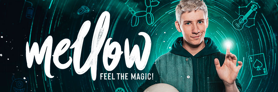 Mellow katapultiert dich in ein neues Universum! Der sympathische Magier im Kapuzenpulli ist Deutscher Meister der Zauberkunst (Parlor Magic) und begeisterte mit seinen Liveshows bereits über 100.000 Menschen von jung bis alt. Auf Social Media und im internationalen TV verblüfft er inzwischen Millionen – und das fernab vom Las Vegas Klischee. Mellow definiert mit kreativen Illusionen und humorvollem Storytelling Zauberei neu – und schubst deine Wahrnehmung mit einem verschmitzten Grinsen aus der Umlaufbahn.
